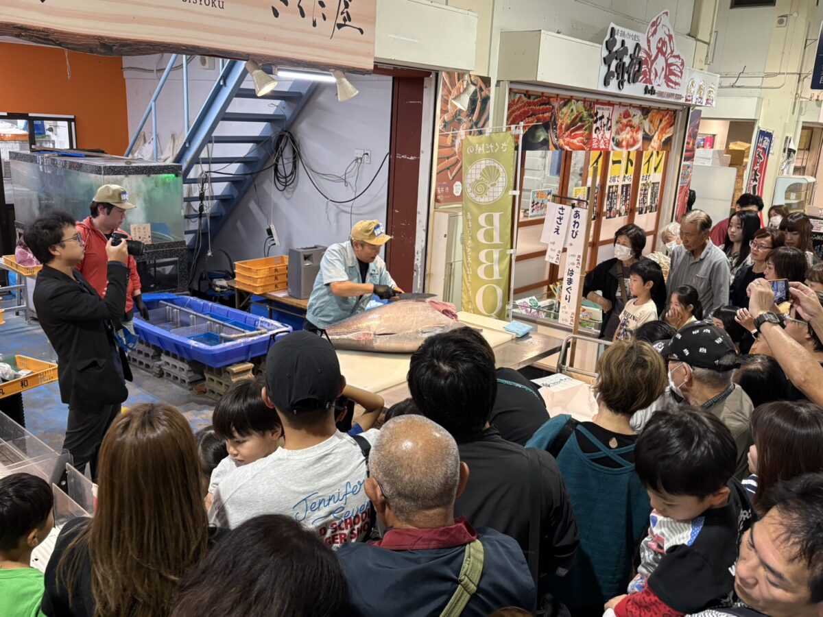 毎年大人気のマグロ解体ショーでは、今年もたくさんの人だかりができ