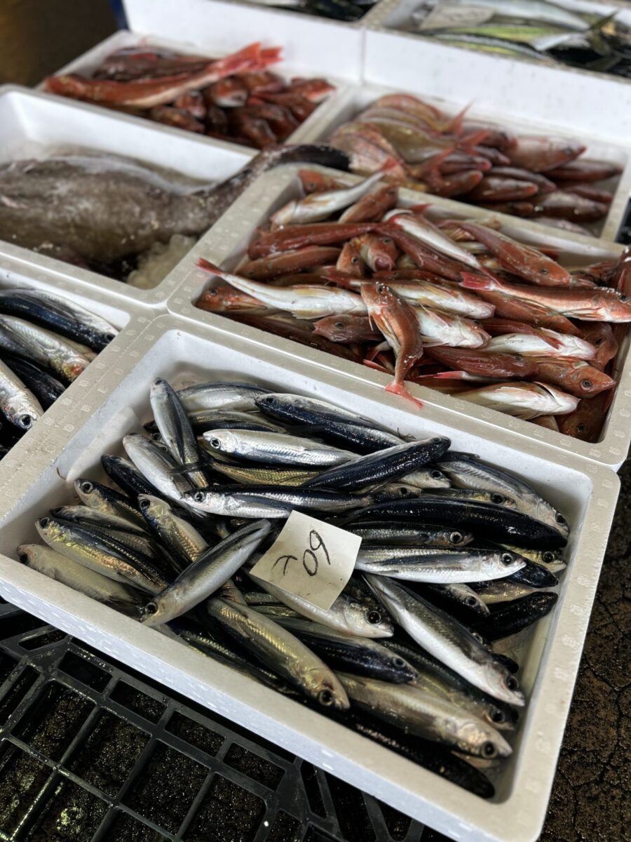 近海今朝とれ市では、その日ごとに異なる旬の魚が並びます。